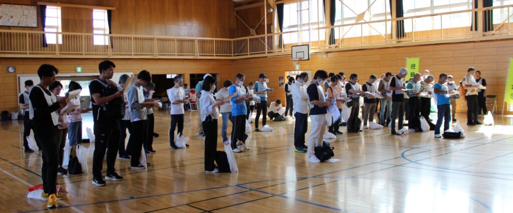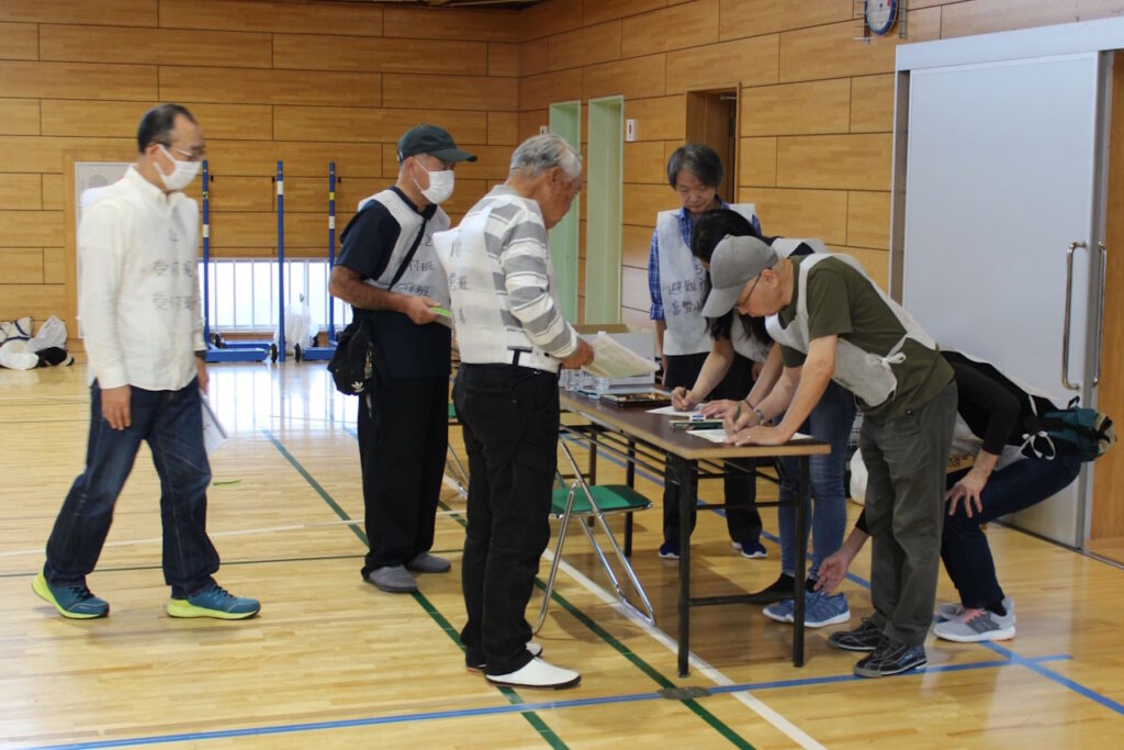 事前登録を行なって参加された皆様は参加票を提示して受付を行い、訓練時に必要なマニュアルや道具を受取りました。