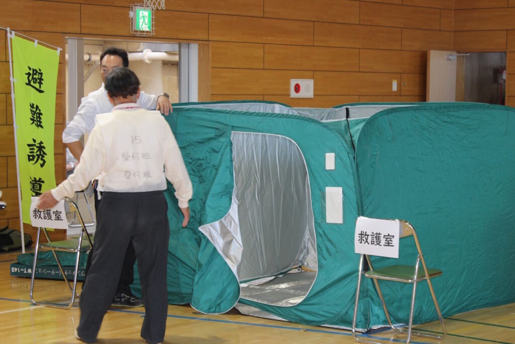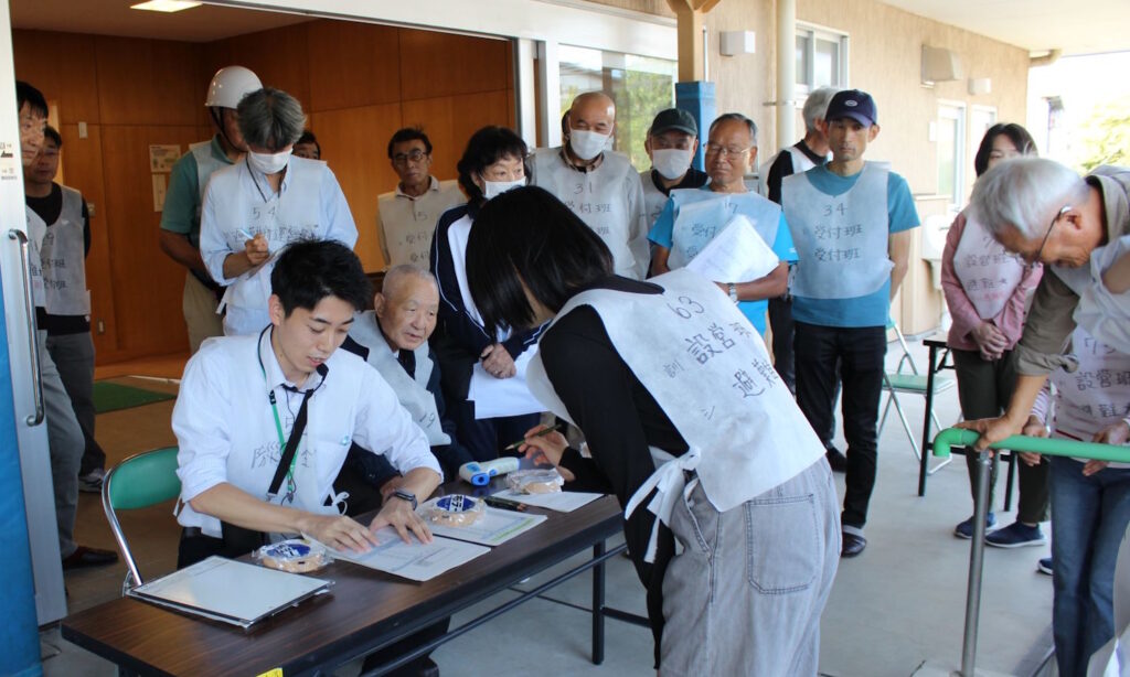 設営担当や市役所からの応援の皆様が避難者となり、模擬訓練を行いました。
