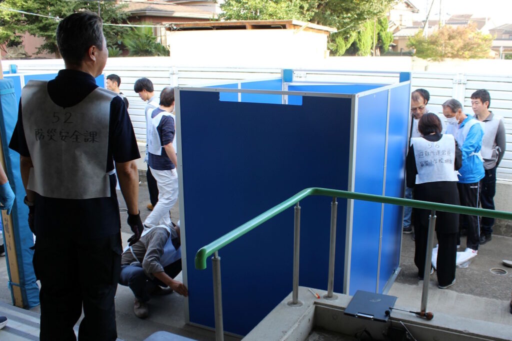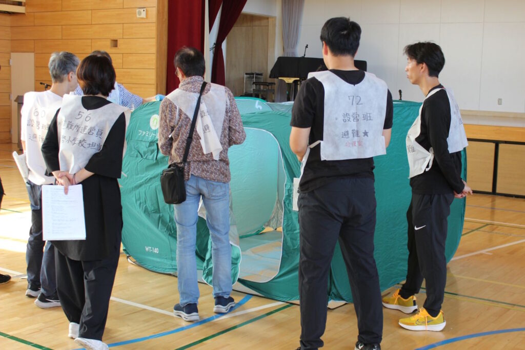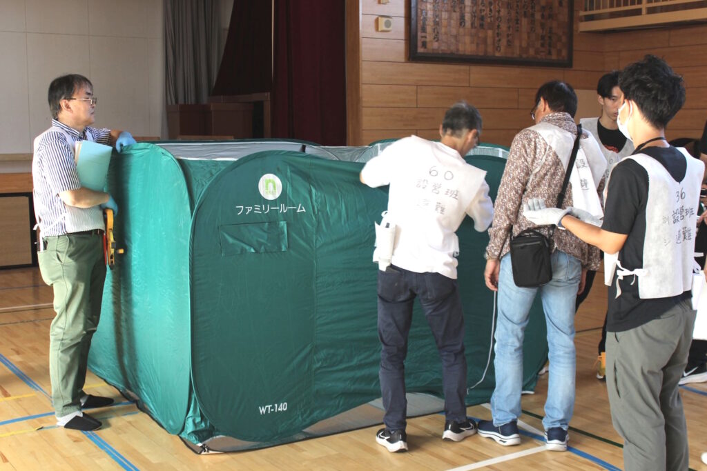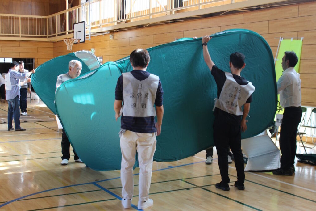 ・設営班は、体育館内のパーティション(簡易的な間仕切り)やマンホールトイレについてレクチャーを受けながら設営を行いました。