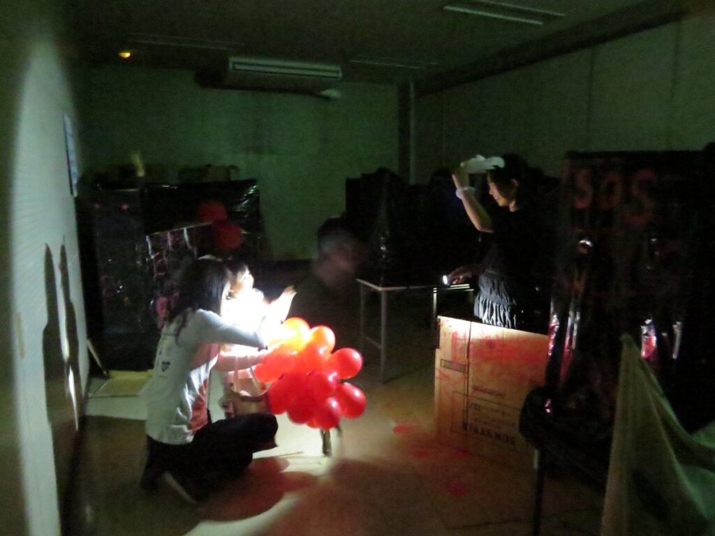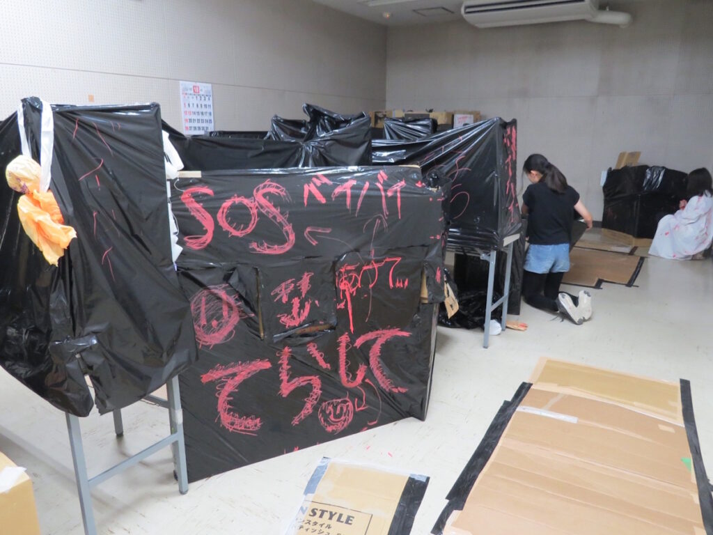 スタッフの子ども達は事前に準備しておいた、おばけグッズを配置したり、作った家の中に入ったり体の揺れ方を確認したりして、始まりの時間を待ち構えていました。
