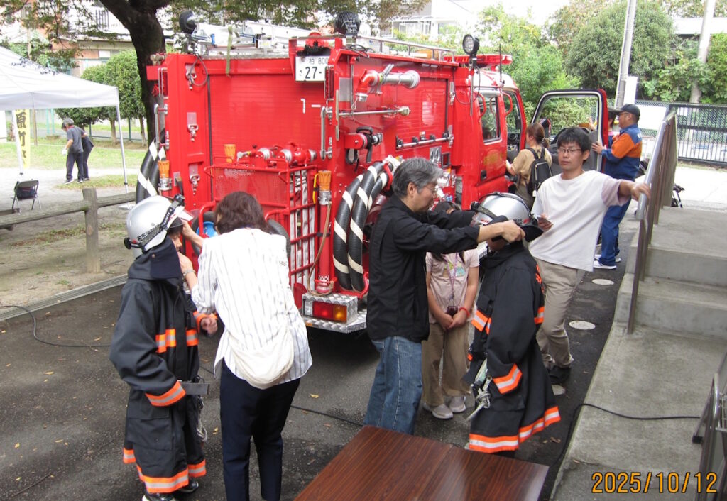防災イベント「消防車を体験しよう」では、消防団との写真撮影や防災クイズが行われ、親子での参加が目立ちました。