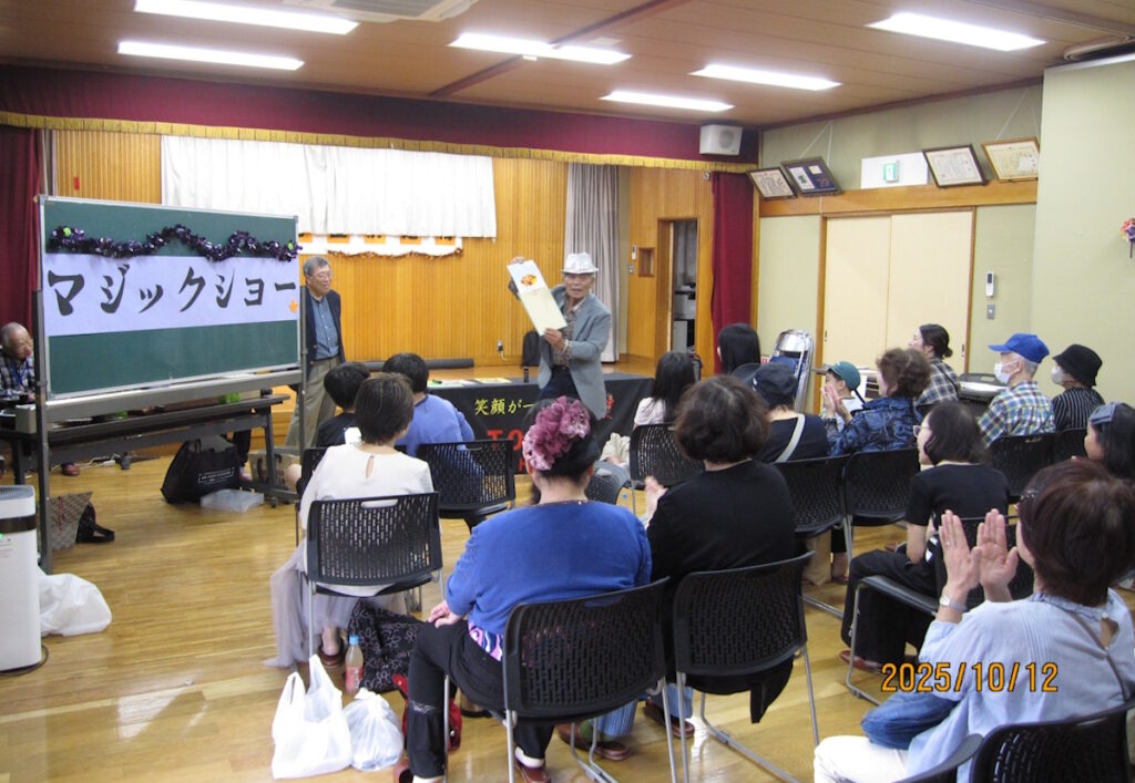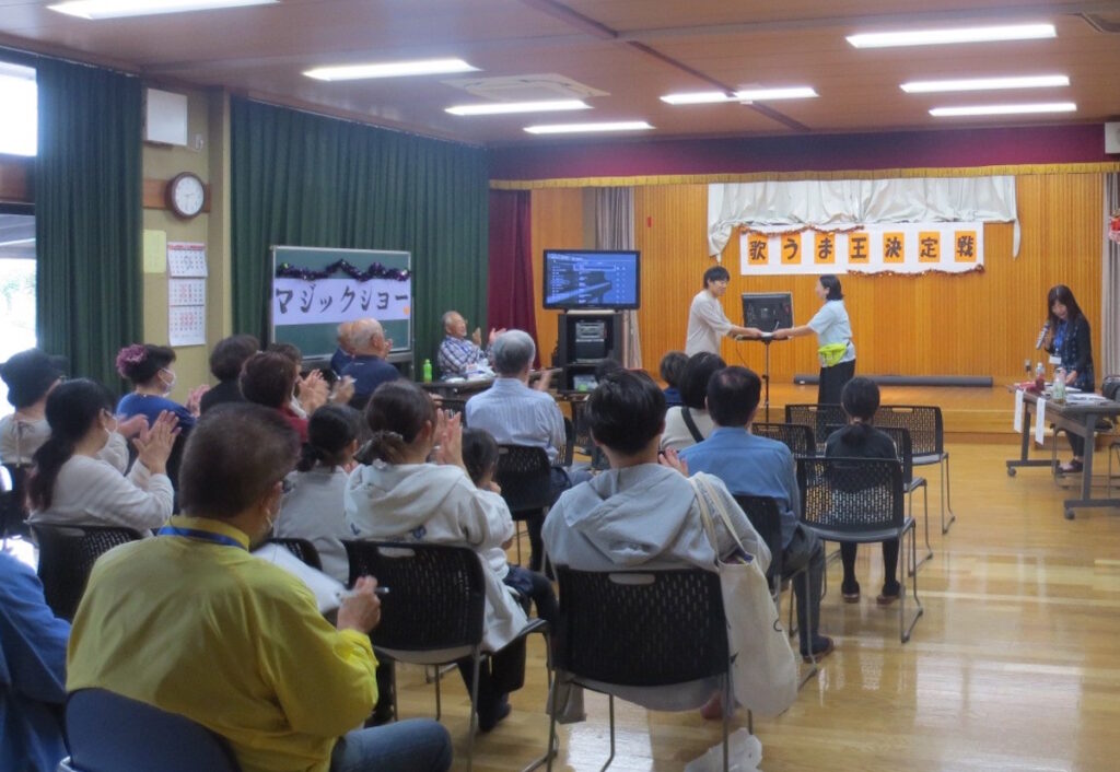 前原会館内では、ボランティアによるマジックショーが行われました。その後、歌うま王決定戦が行われ、子どもから高齢者まで参加して声援の中、歌自慢が喉を競い合いました。