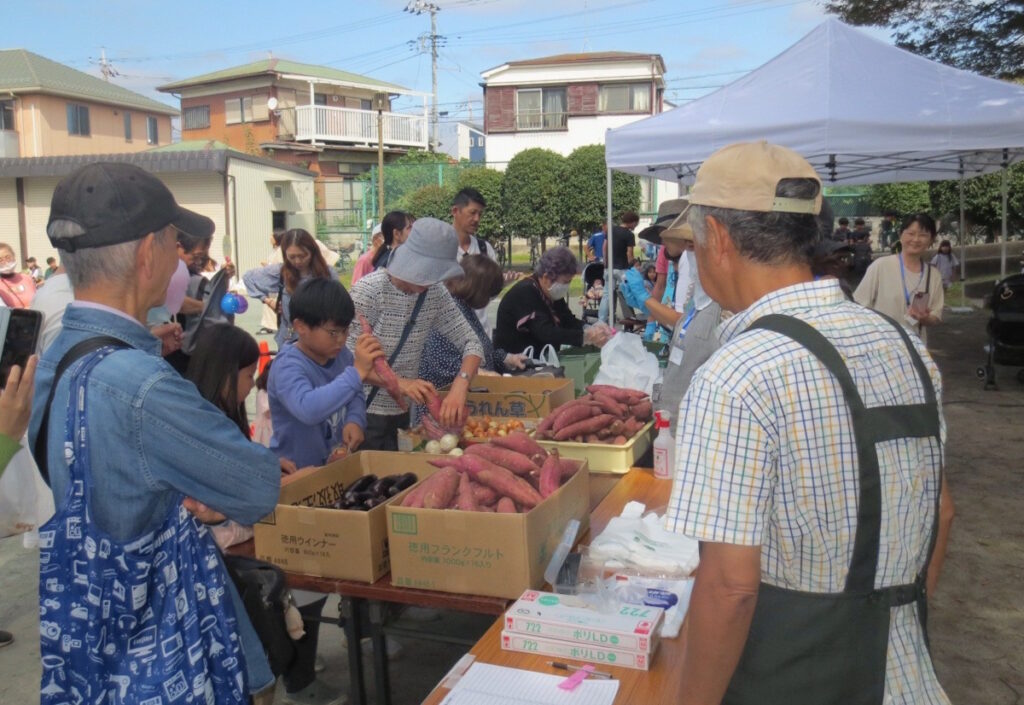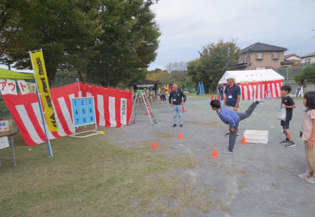野外(前原ポケットパーク)では、 ストライクアウト、グラウンドゴルフ、射的、型抜き、スマートボール、ヨーヨー釣りの各種ゲームや模擬店、和太鼓体験コーナーが行われ、笑顔と拍手が溢れました。人気のストライクアウトや射的では長い行列が終始続いていました。野菜詰め放題、新米一升盛り放題も大好評で、夢中で袋詰めに興じていました。